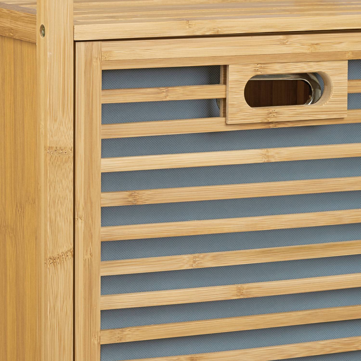 Maximize your small bathroom's storage with this bathroom shelf featuring an integrated laundry basket, offering discreet and stylish organization. Crafted from eco-friendly bamboo, it's perfect for humid spaces.
