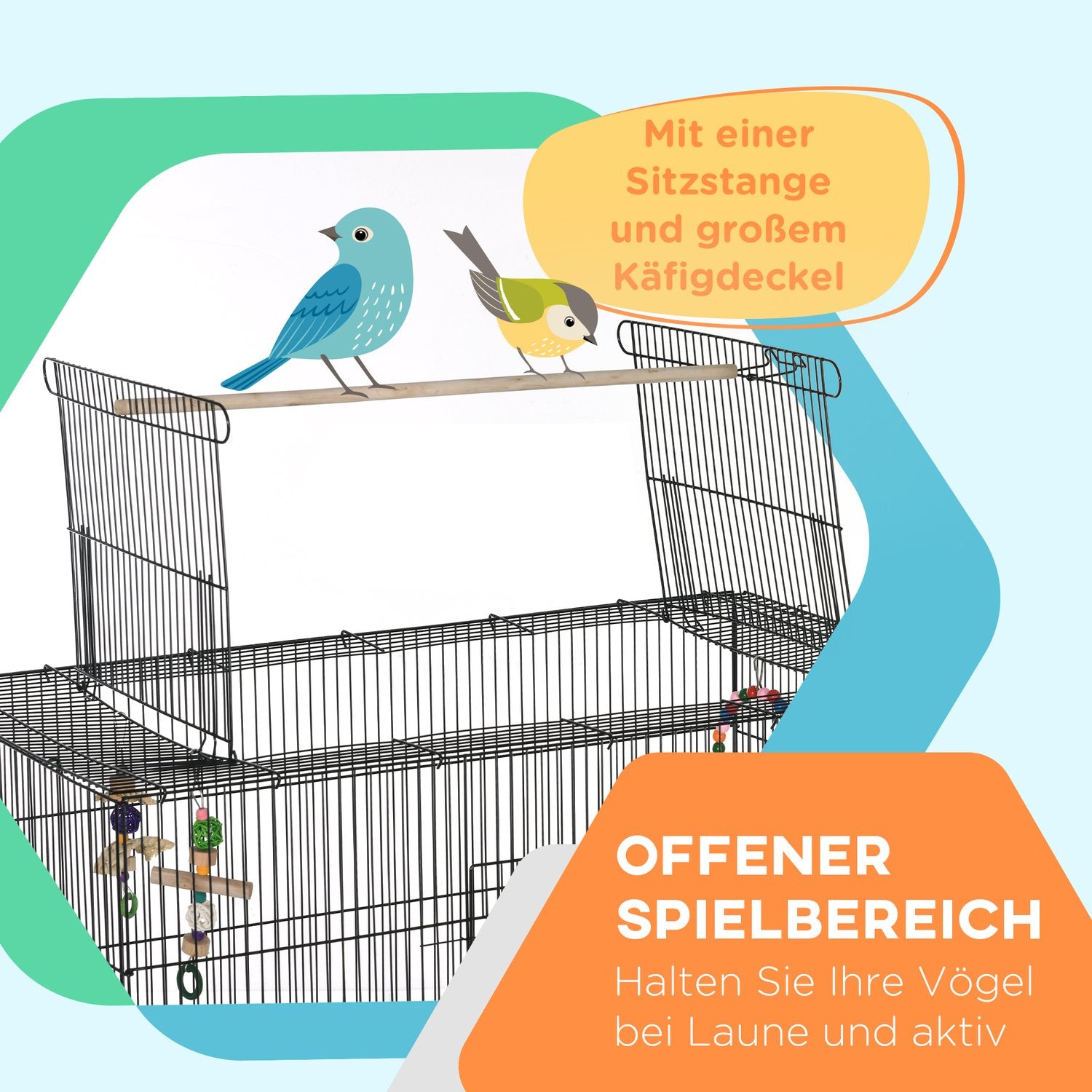 This birdcage doesn't just promise a haven for your birds; it provides a complete entertainment hub. Birds can stretch their wings, serenade you from their wooden perches and nibble freely thanks to the cleverly designed food and water bowls. The open top and accompanying toy are the finishing touches that turn simple homes into a bird's paradise. Roll it easily from room to room to enjoy the sunshine or keep it still with the practical brakes. Own a birdcage that cares as much as you do. Treat your birds to this blend of comfort, safety and fun today.