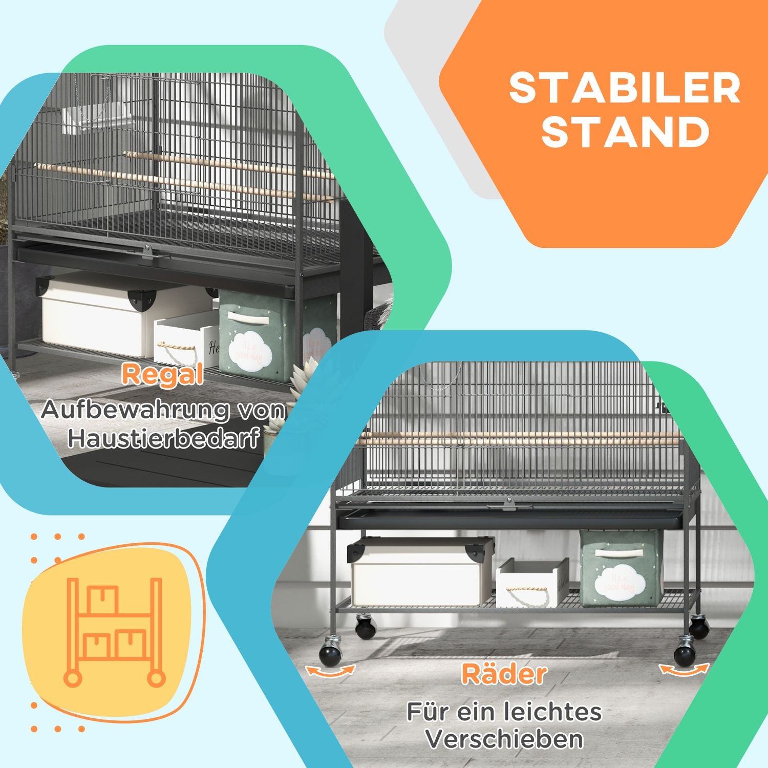 Large gray bird aviary with perches and wheels, 94 x 57 x 153 cm