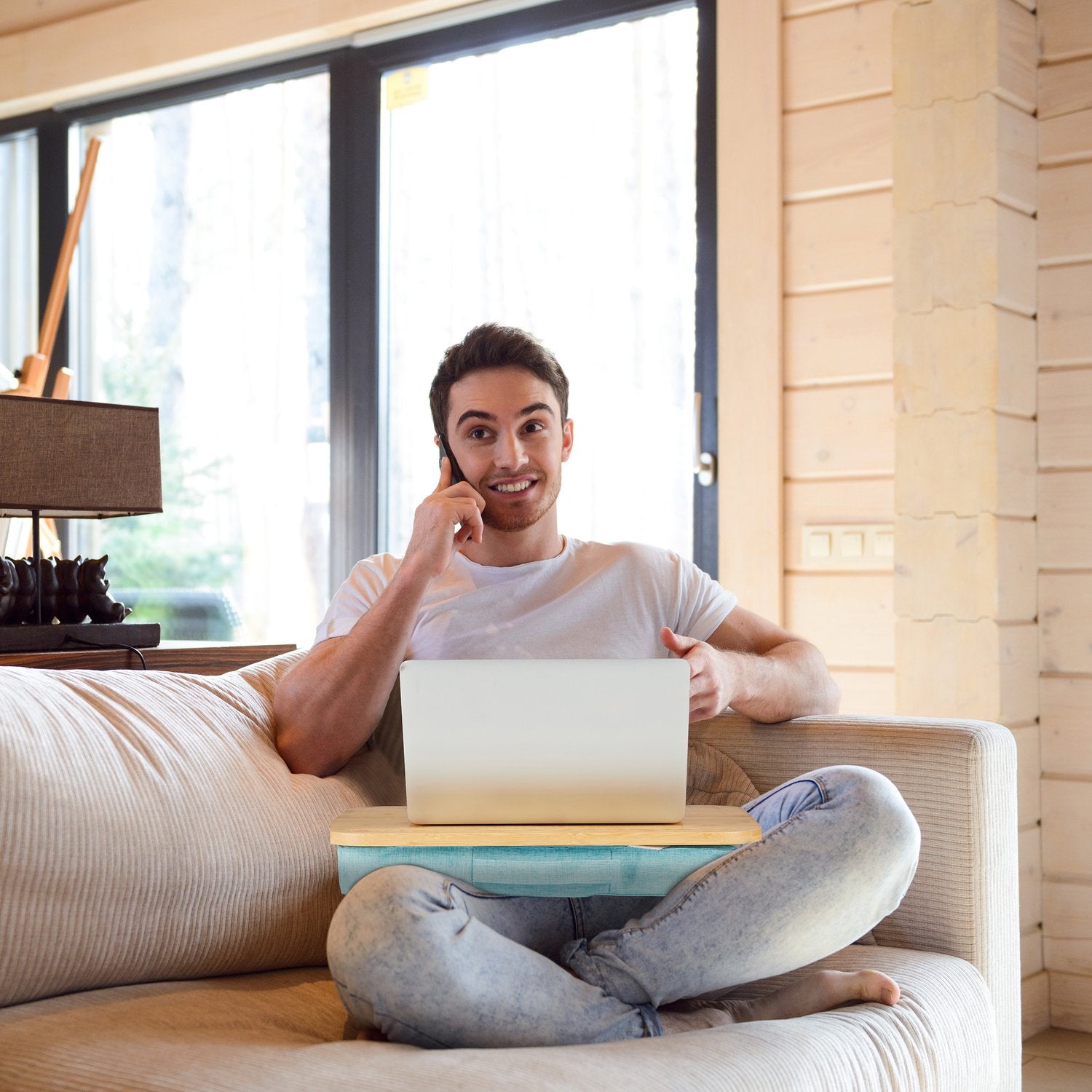 Enhance your productivity with our bamboo laptop tray, offering comfort and efficiency for remote work. This lapdesk's spacious surface supports various laptop sizes and includes a phone and tablet holder.
