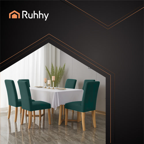 Transform your dining space with these bottle green chair covers, crafted from elastic velvet for a snug fit and elegant look. These covers protect and refresh your chairs effortlessly.
