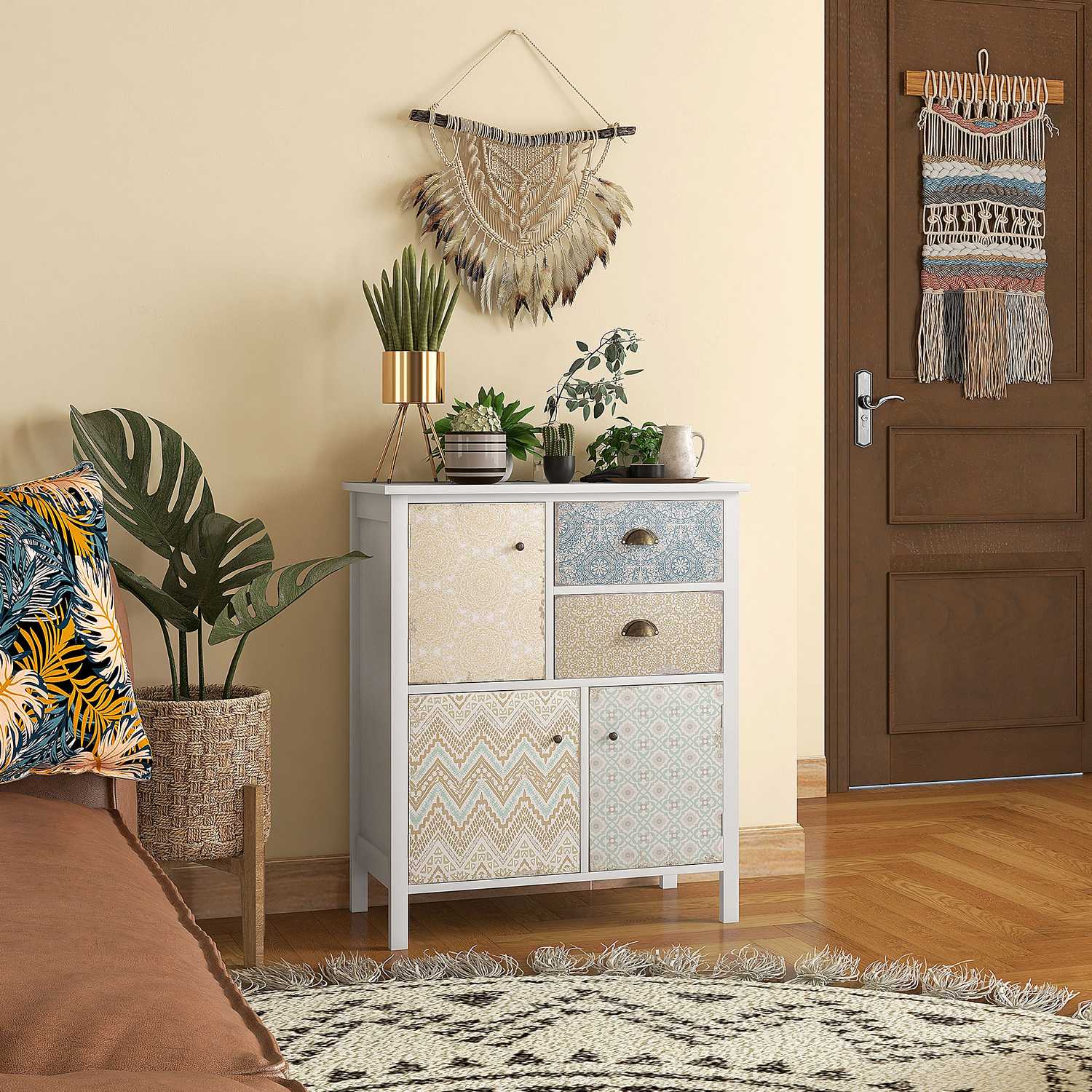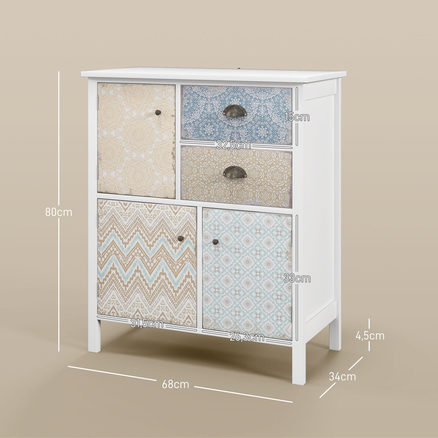 Elevate the atmosphere of your home with this shabby chic chest of drawers, a must for stylish storage solutions. Within its vibrant and retro-inspired design, the dresser has plenty of space to organize essentials with 2 drawers and 3 cabinet compartments. The nostalgic handles add a touch of vintage charm, while its sturdy white wooden frame supports up to 25kg. Easy assembly ensures it is a comfortable addition to any room.
