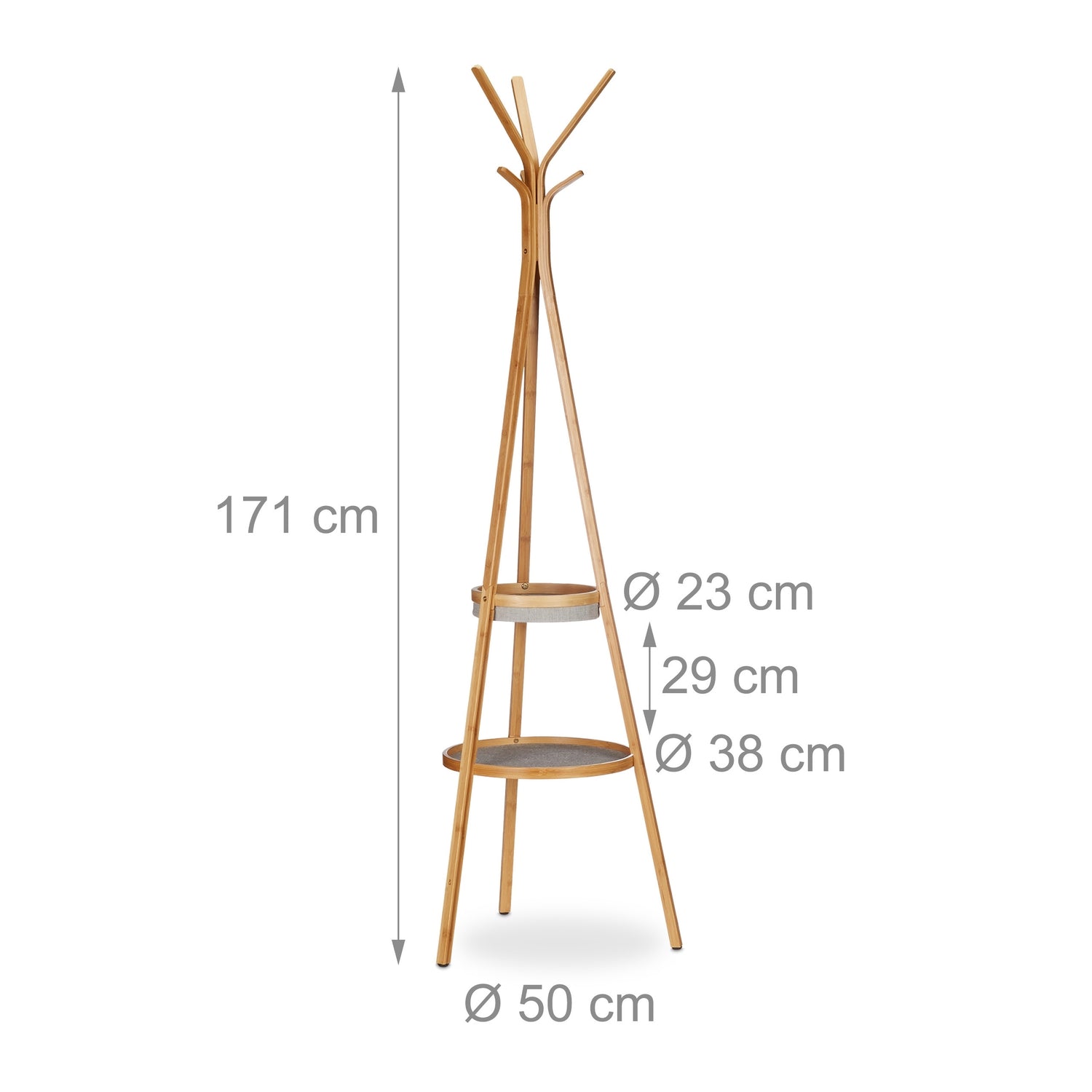 The bamboo coat rack with round shelves offers stylish organization for jackets and keys, enhancing any hallway with natural charm and functionality.