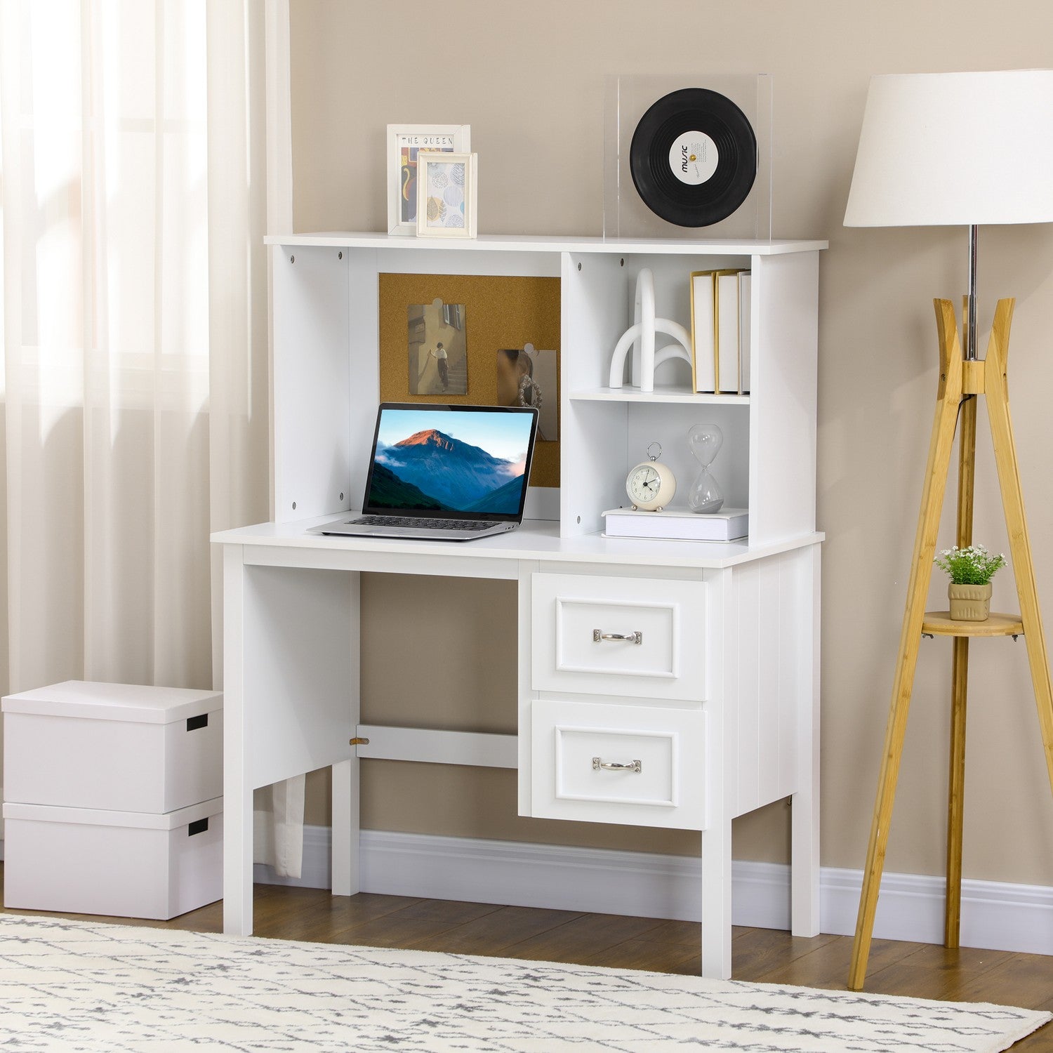 Computer table with drawers and cork top - White