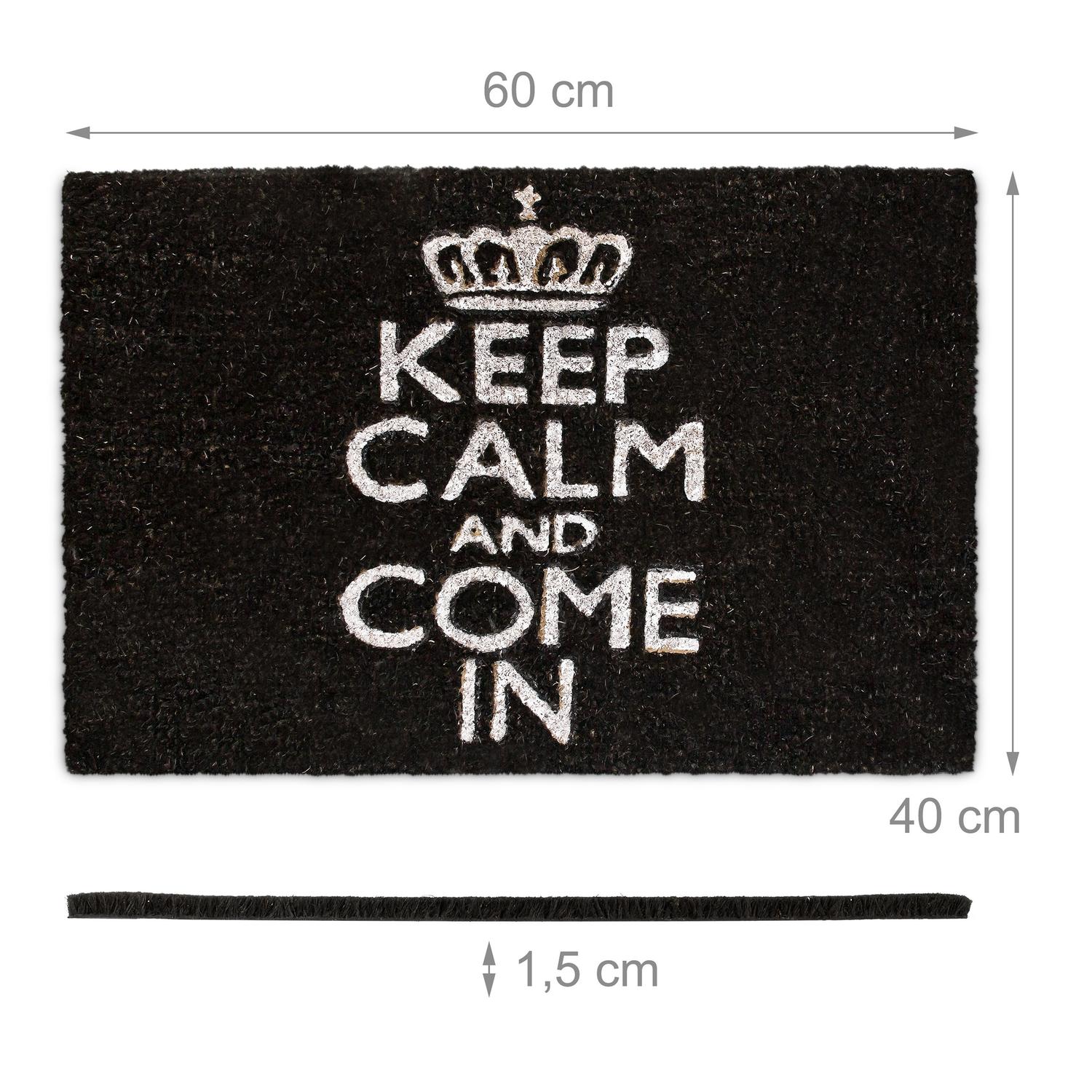 Enhance your entryway with a stylish black doormat featuring the text ""Keep Calm and Come In"". This durable coconut fiber mat offers weather resistance, perfect for welcoming guests indoors or outdoors.