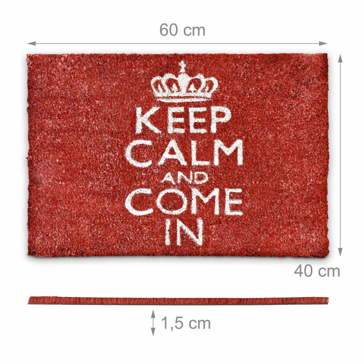 Enhance your entryway with this red doormat featuring ""Keep Calm and Come In"". Crafted from durable coconut fiber, it effectively traps dirt while adding a welcoming touch to any doorstep.