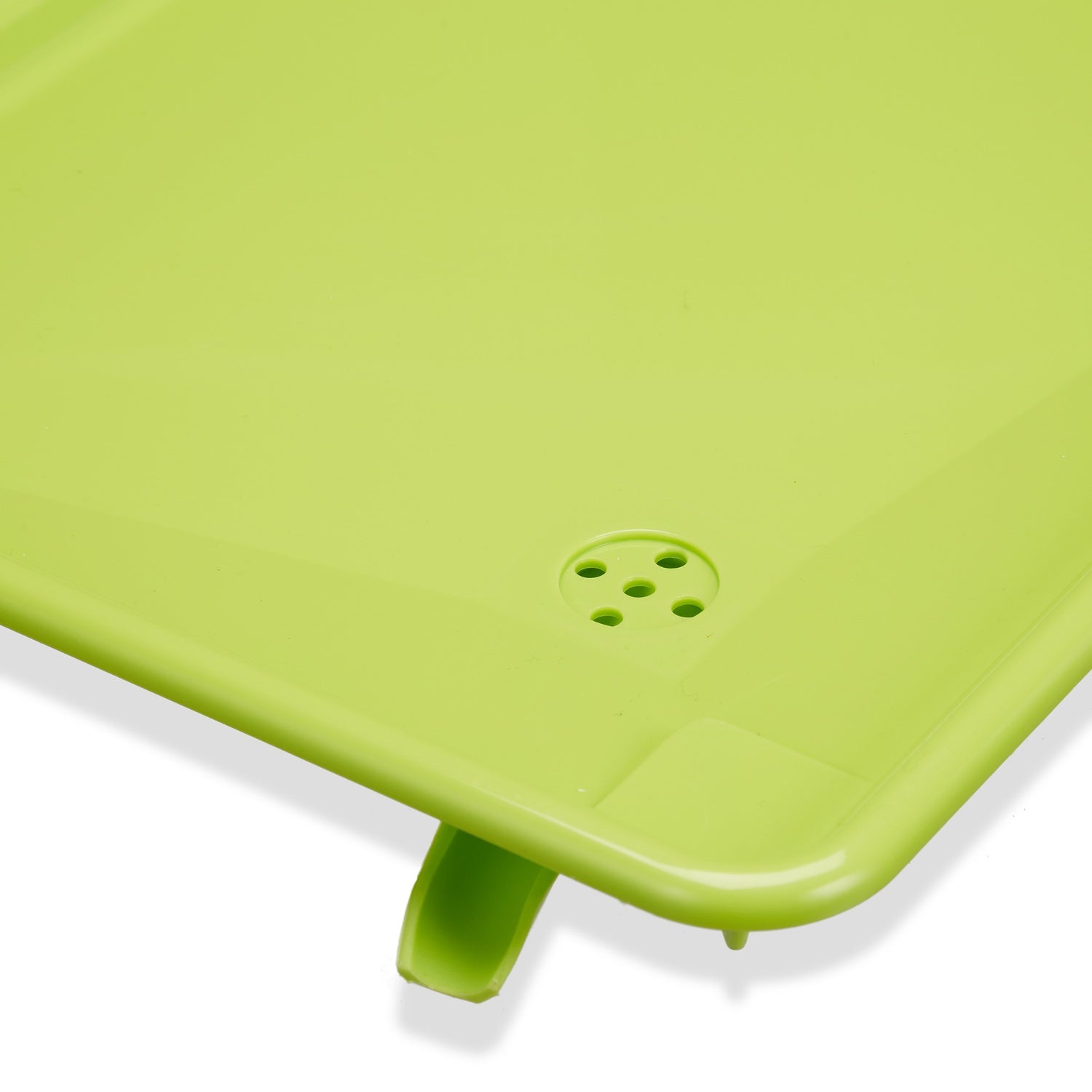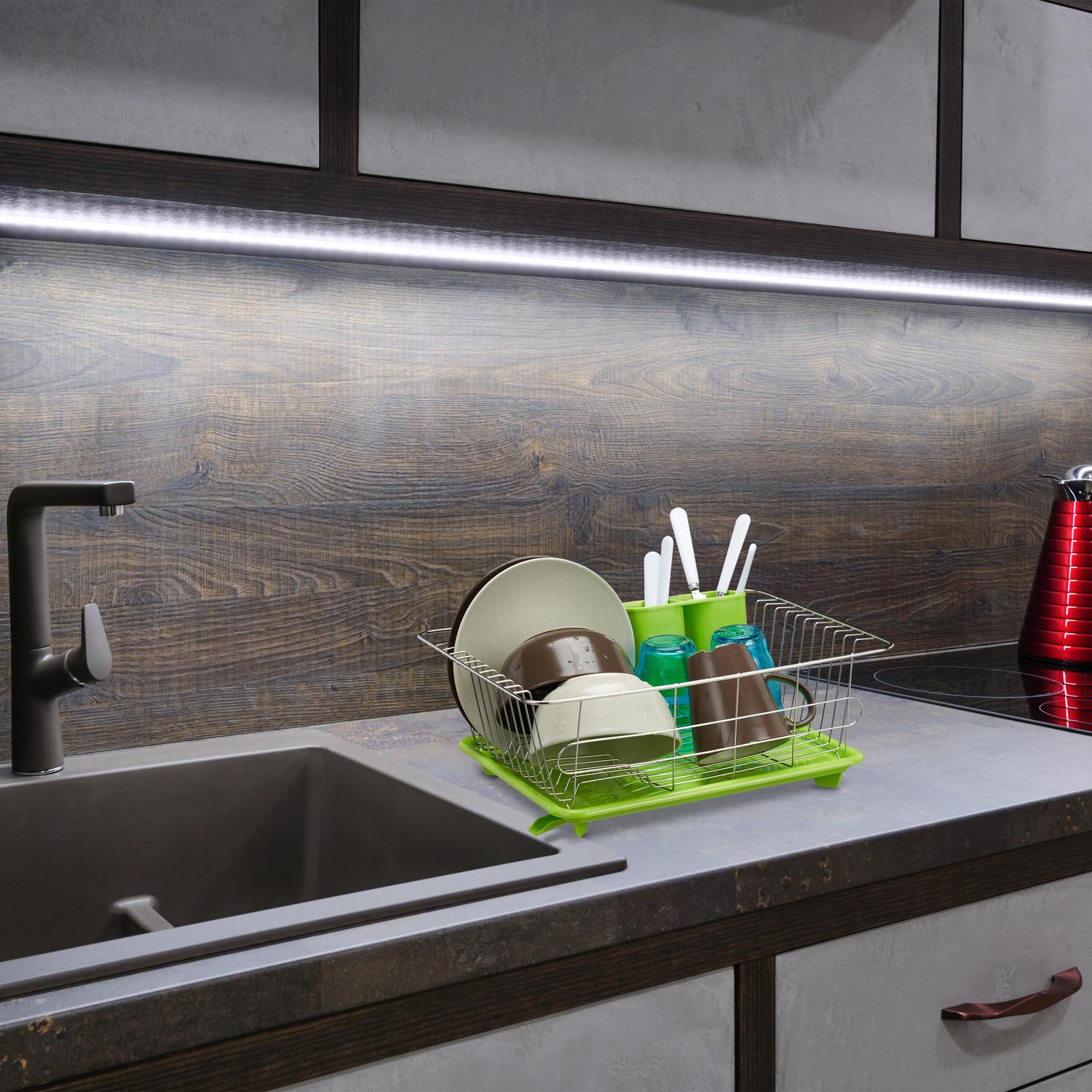 The green drain basket with cutlery holder streamlines dish drying by efficiently collecting excess water, ensuring your kitchen stays tidy and organized.
