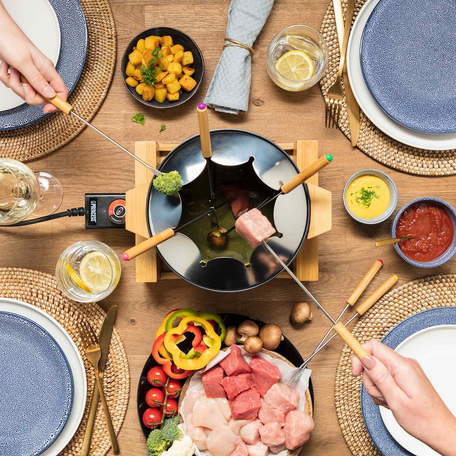 Introducing the stylish and versatile Fondue Set, designed to elevate your dining experience with its sleek black finish and bamboo casing. This fondue set is perfect for hosting memorable gatherings, whether you're indulging in a savory meat fondue, a rich cheese fondue, or a decadent chocolate fondue. With a generous 1.5-liter capacity, it comfortably serves up to eight people, making it ideal for both intimate dinners and larger parties.
