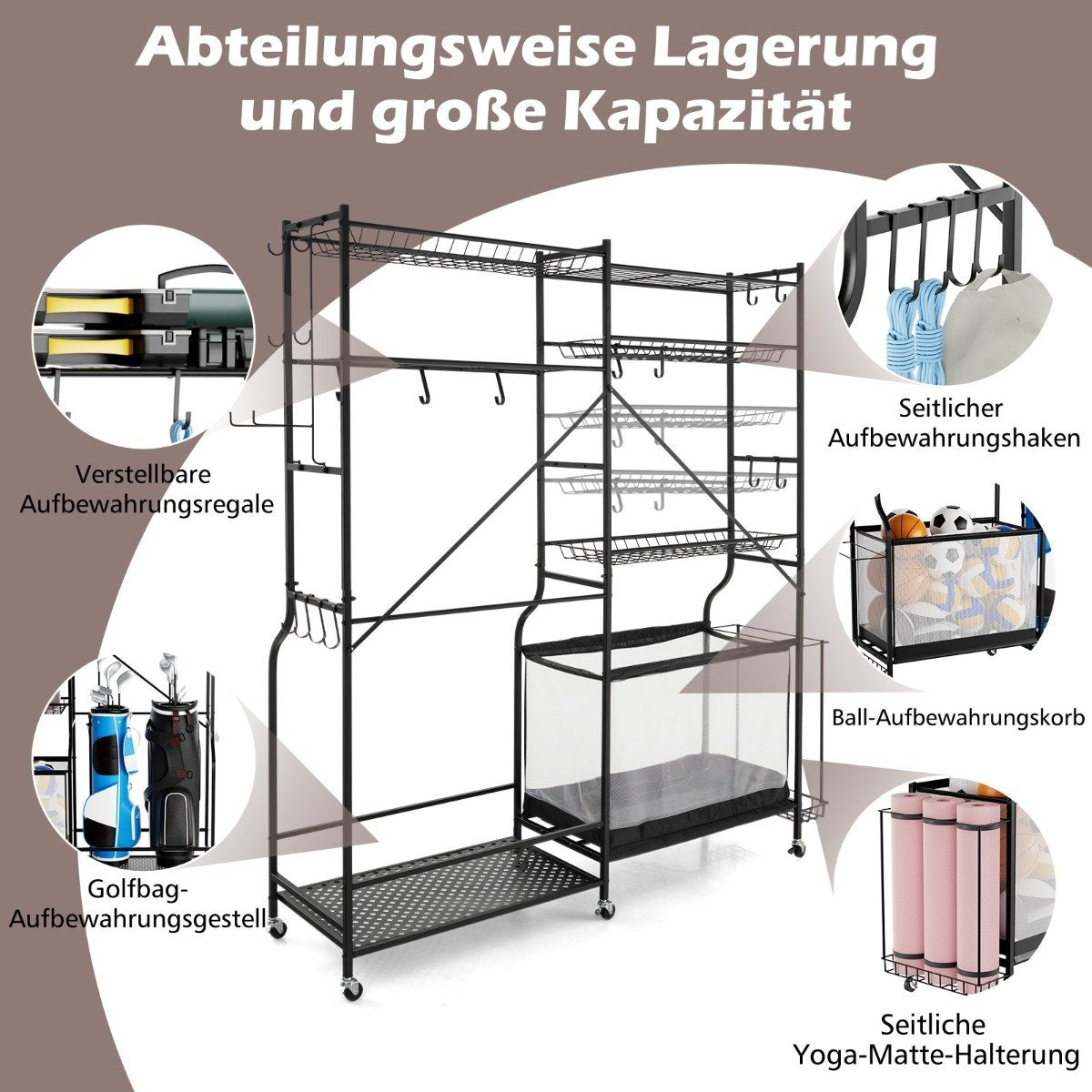 Keep your space clutter-free with the All-in-One Sports Equipment Organizer, a versatile storage solution designed to accommodate a variety of sports gear. This organizer is perfect for athletes and fitness enthusiasts who need a reliable way to store their equipment. With its spacious golf bag holder, yoga mat holder, and ball basket, this organizer can hold up to two golf bags, various balls, and yoga mats with ease. Its five adjustable storage compartments allow for a customizable arrangement, ensuring that all your equipment fits perfectly.