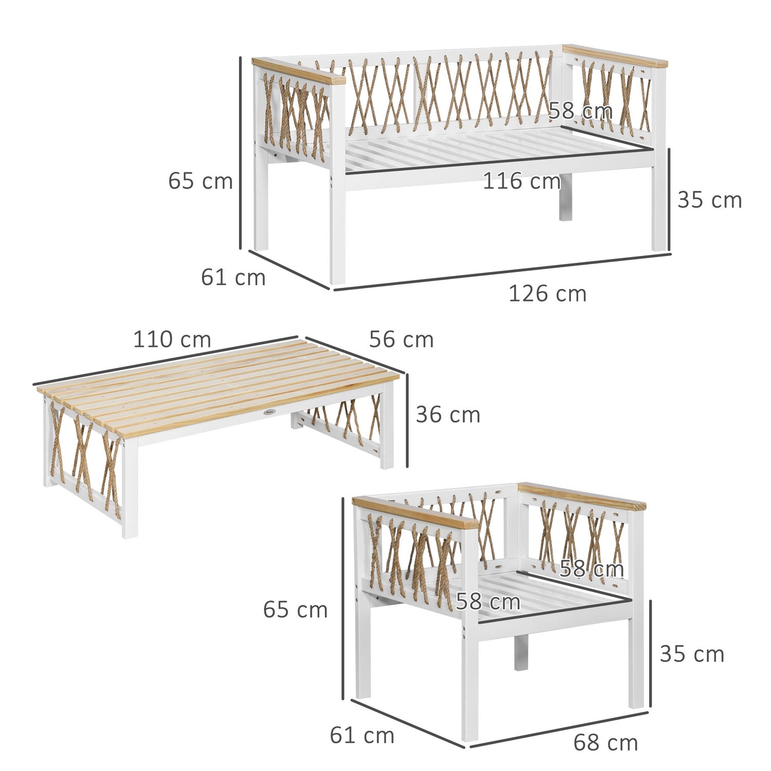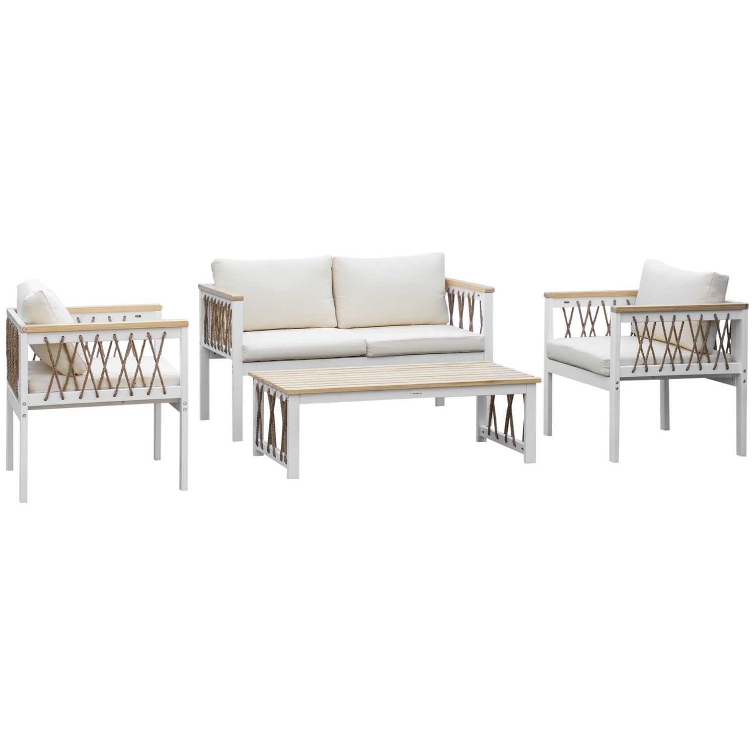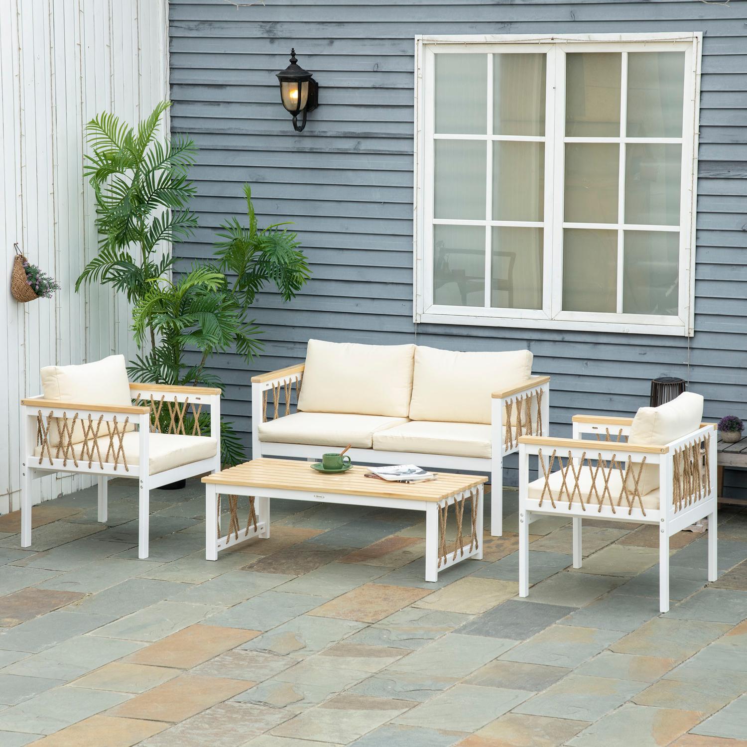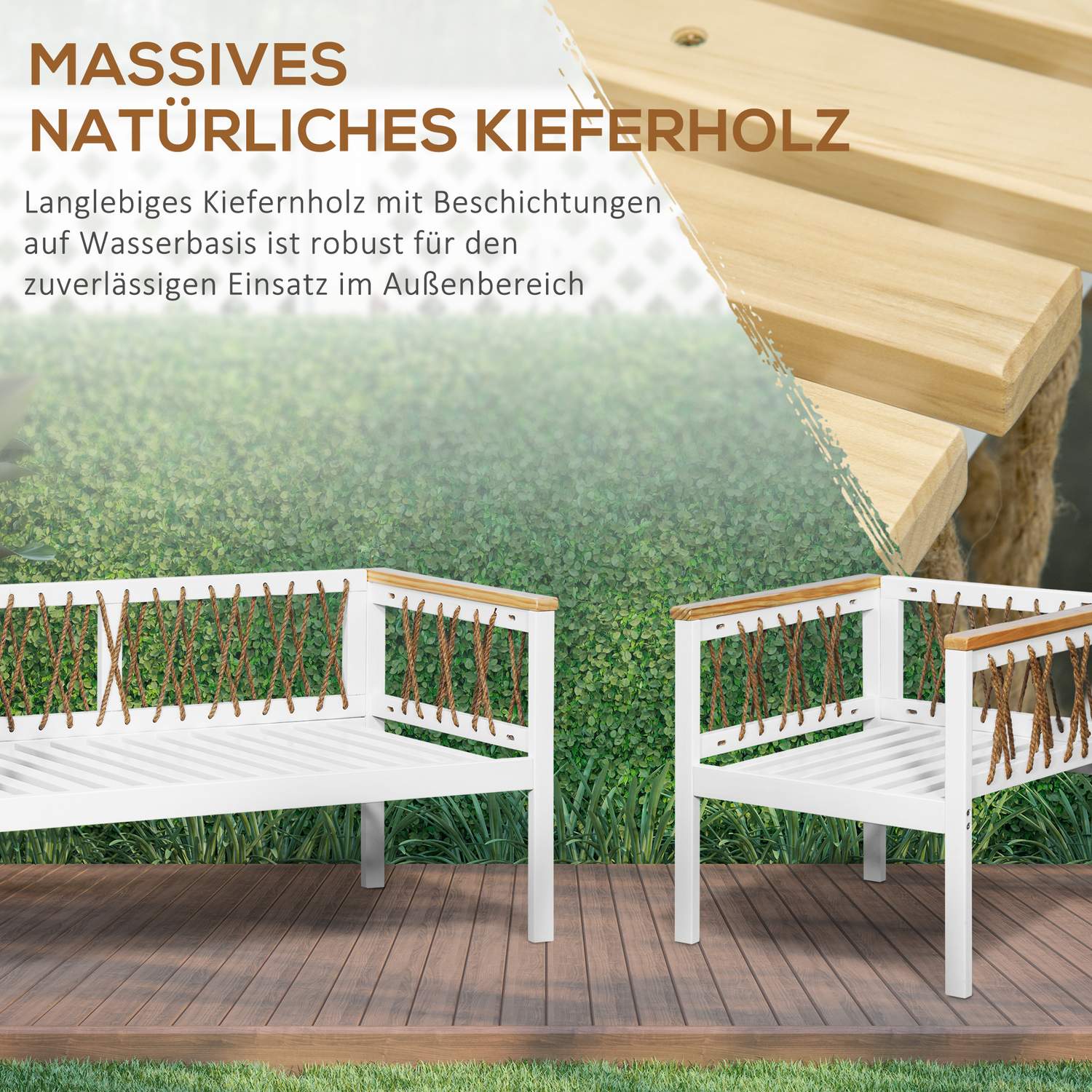 Transform your outdoor space into a stylish retreat with this 4-piece patio set. Crafted from sturdy spruce wood, this ensemble promises durability and elegant charm. Designed for quiet moments, it includes two armchairs, a bench and a side table, all adorned with plush cushions for exceptional comfort.