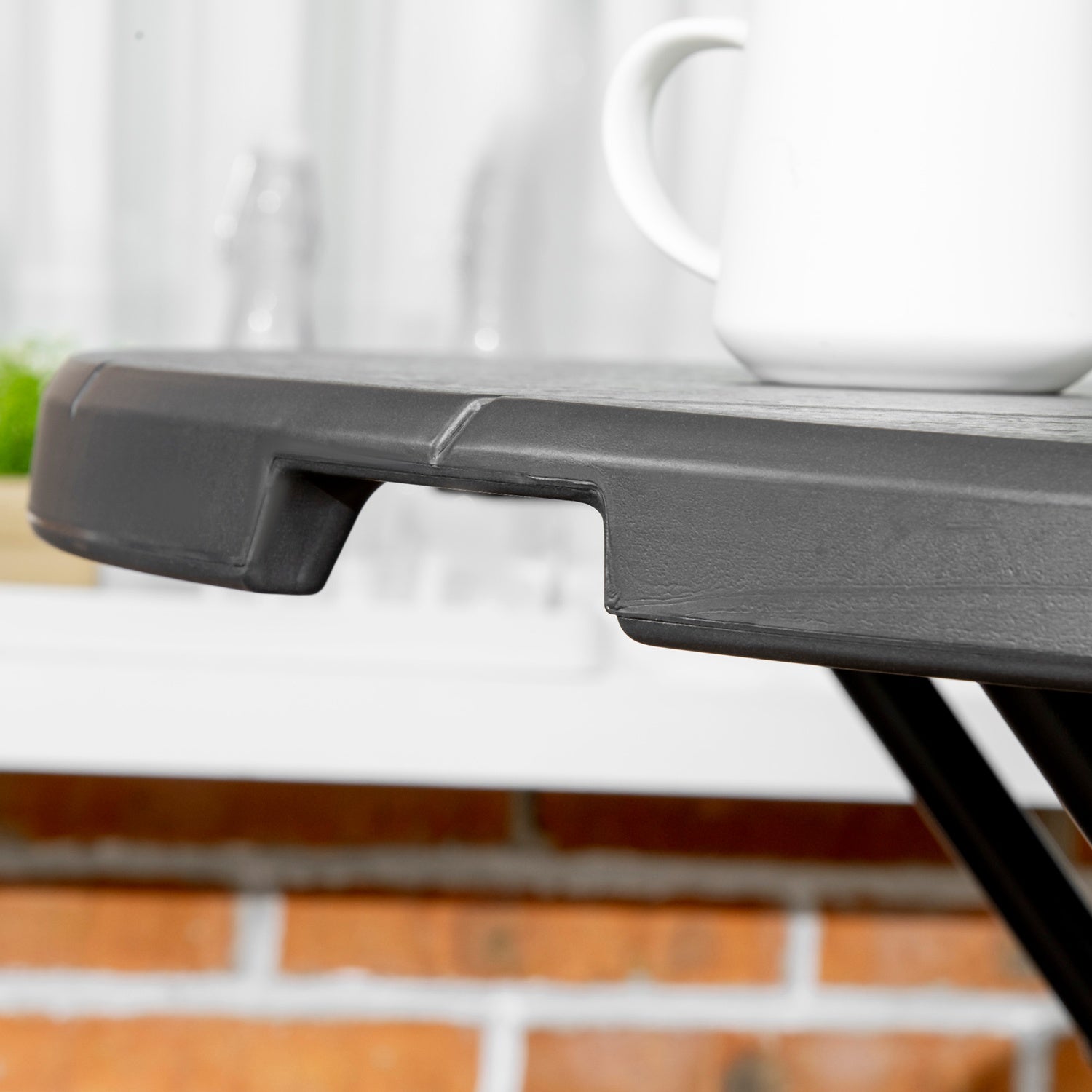- Weather resistant tabletop mimics an elegant wood finish.