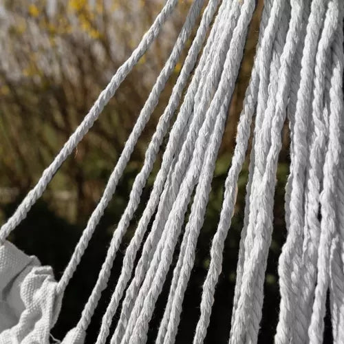 The pleasure of using your garden, terrace or balcony can be increased by using comfortable furniture and lounge accessories. A hanging garden seat is a specific type of armchair that works on the principle of a hammock. It has a comfortable, soft seat and backrest made of natural cotton with a delicate admixture of polyester. This makes it not only pleasant to the touch, but also durable.