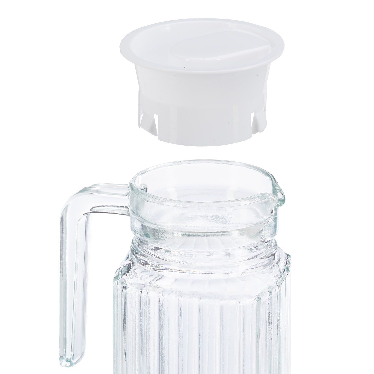 The glass juice jug with handle offers a sleek design for easy fridge storage, keeping your beverages cool and accessible. Perfect for water, juices, or tea, this jug enhances any setting with style.