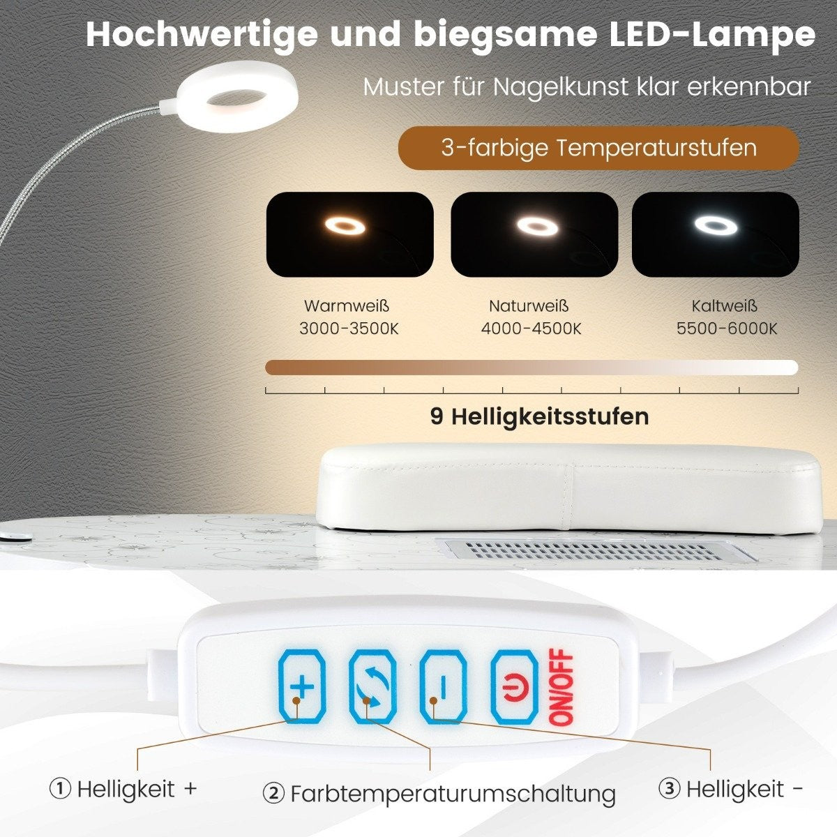 The built-in electric dust collector is a game-changer, ensuring your workspace remains clean and dust-free while cutting or filing nails. With a simple one-click operation, this feature is user-friendly and comes with three dust bags for easy replacement. The flexible LED table lamp is another highlight, offering three color temperatures and nine brightness levels to suit any environment. Adjust the angle as needed to execute intricate nail designs with precision.