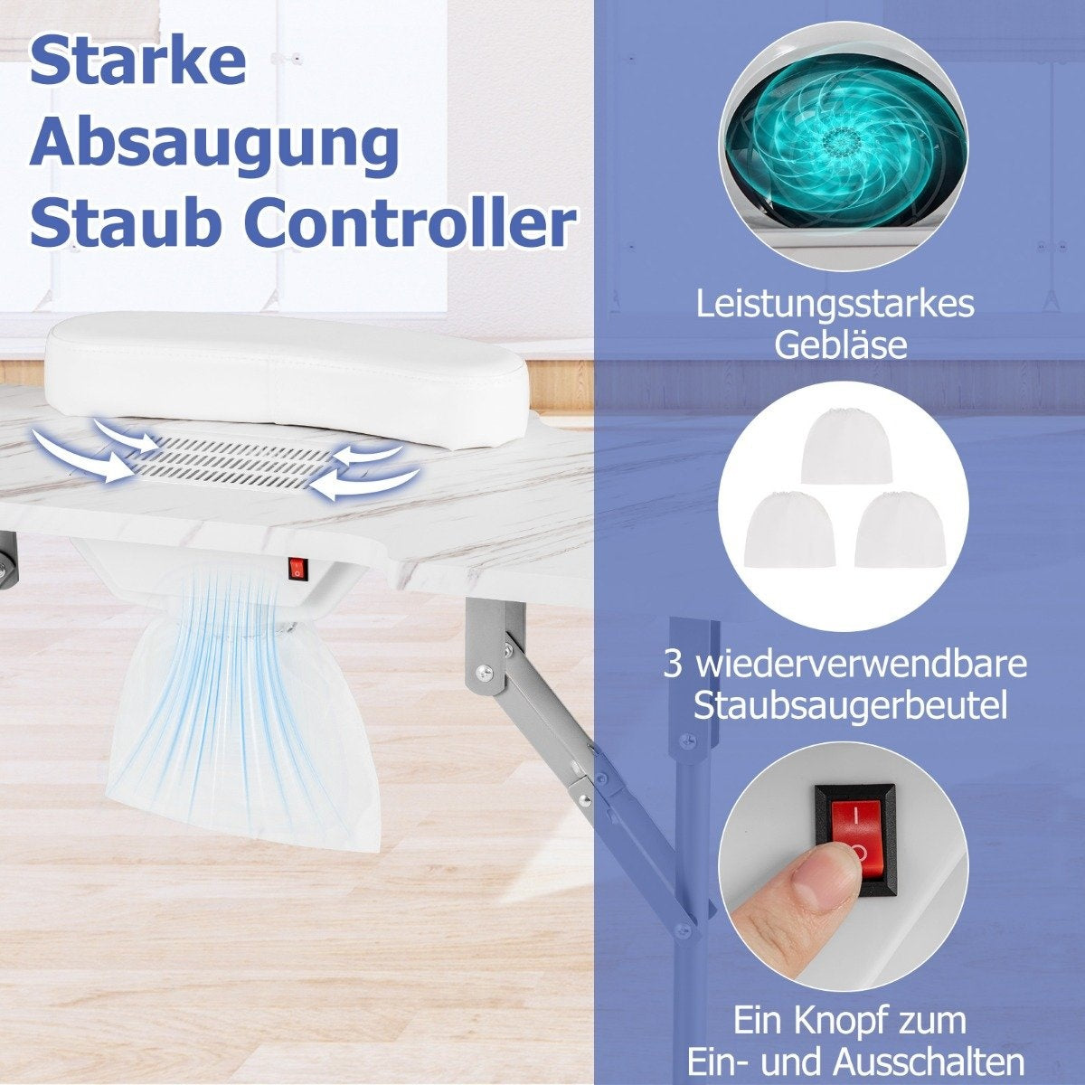 With its robust and rust-free metal frame, the manicure station ensures long-lasting use. The smooth, rounded corners reduce the risk of accidental injuries, making it a safe choice for any professional setting. The included accessories, such as the lamp, electric dust collector, wrist cushion, and dust bags, complete this comprehensive manicure station, making it an indispensable tool for any nail artist.
