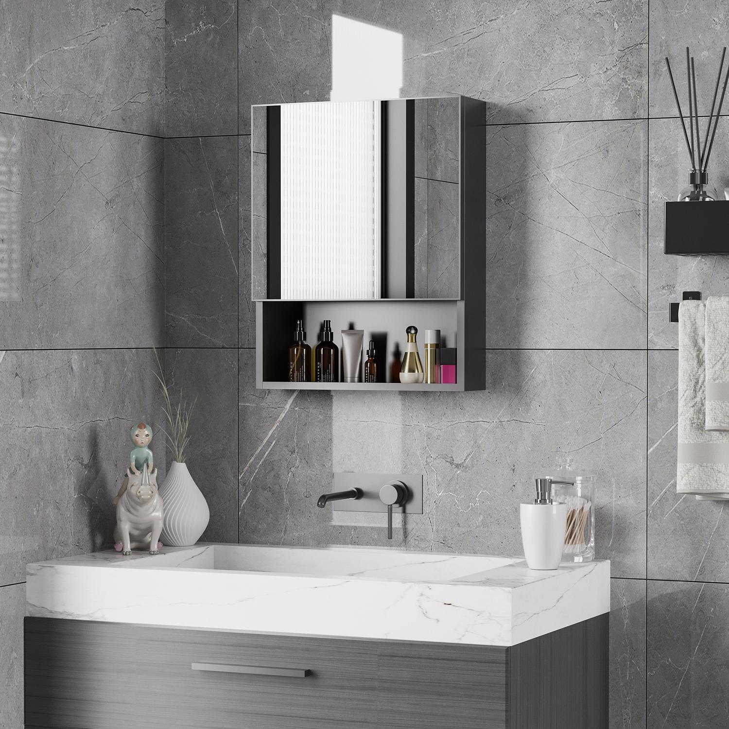 Tired of the mess in the bathroom? This elegant bathroom cabinet with a mirror front is your space-saving answer. Mount it on the wall to maximize small spaces while keeping essentials close at hand, thanks to two wide inner shelves and an open shelf that's perfect for the whole family.