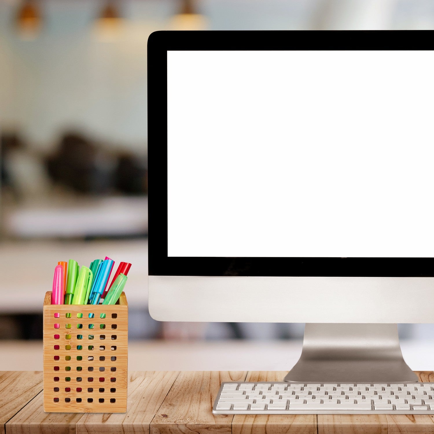 Optimize your office organization with this perforated bamboo pen holder, designed to keep essentials like pencils and scissors within easy reach. Its natural bamboo finish adds elegance to any workspace.