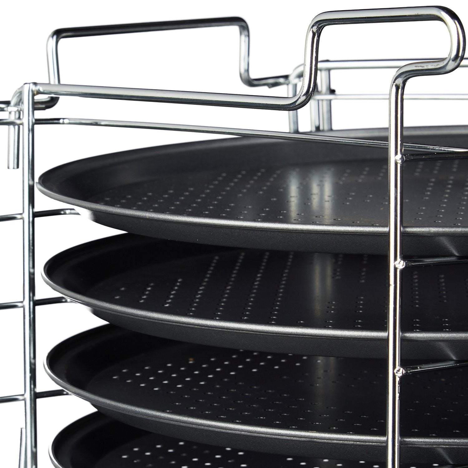 Pizza plates set with stand enhances homemade pizza baking by allowing simultaneous cooking of up to four pizzas. Enjoy evenly baked, crispy crusts with optimal air circulation.
