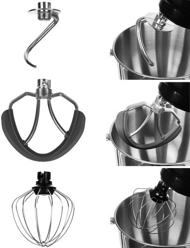 - 3 TYPES OF TIP - 3 attachments for food preparation are included in the set. A stirrer with silicone ribs is used to perfectly combine the ingredients of the dough. The hook has been designed to knead dough, e.g. yeast dough, and a whisk , which is used to whip light ingredients such as whipped cream or egg whites.