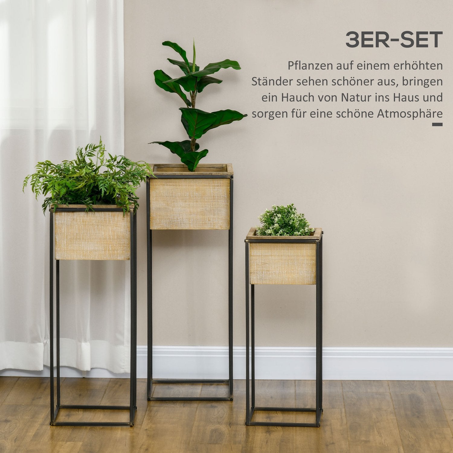 Show off your greenery with this rustic, elegant plant stand, perfect for adding a natural touch to any space. Crafted from spruce wood and sturdy metal, this three-piece stand set offers an elegant way to display your plants and promises to complement and revitalize your home decor beautifully. These stands have different heights and allow a variety of arrangements to create a living garden oasis indoors.