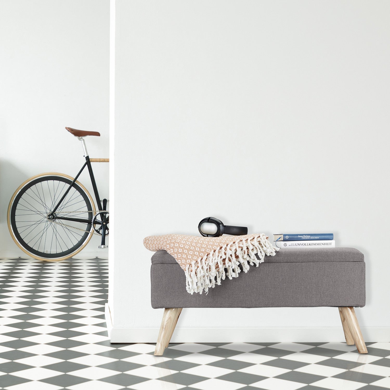 The hallway bench with stylish upholstery offers versatile seating and storage solutions for any room. Its linen-like fabric and wooden legs add elegance while providing practical functionality.