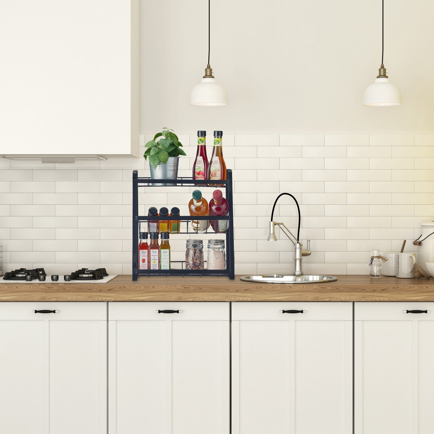 - Organize spices, oils, and herbs efficiently with three spacious tiers.