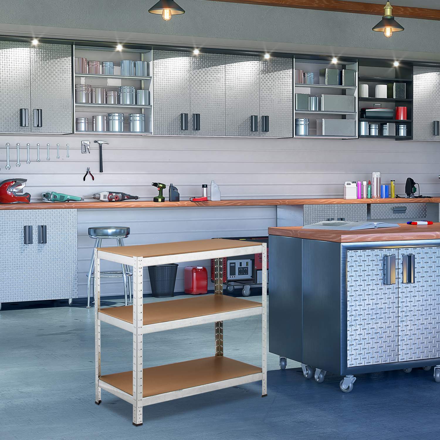 Robust shelf system enhances storage efficiency in basements, garages, and workshops, ideal for heavy items like tires and tools. Adjustable shelves offer customizable organization.