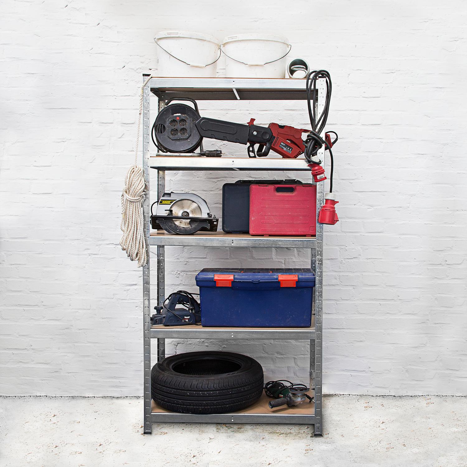 Stable metal shelf offers robust storage for heavy objects, ideal for organizing basements, garages, and storage rooms. This shelving system supports up to 875 kg, ensuring secure storage for tools and boxes.