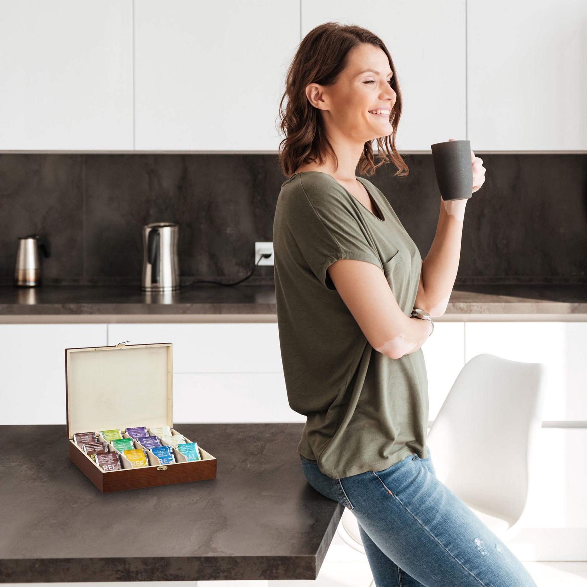 Transform your kitchen with this decorative tea storage box. Its multifunctional design not only organizes but also adds a touch of elegance to any space. Grab yours today and enjoy a tidier kitchen.
