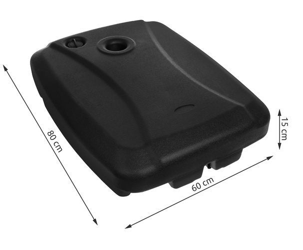 - SPECIFICATION - umbrella opening diameter: 7 cm; handle: yes, 2; wheels: 2; possibility of filling: yes, with water or sand; material: HDPE / metal; a plug for pouring in and out of water: yes; dimensions: 80/60/15 cm; weight: 6.080 kg; weight in the package: 8 kg