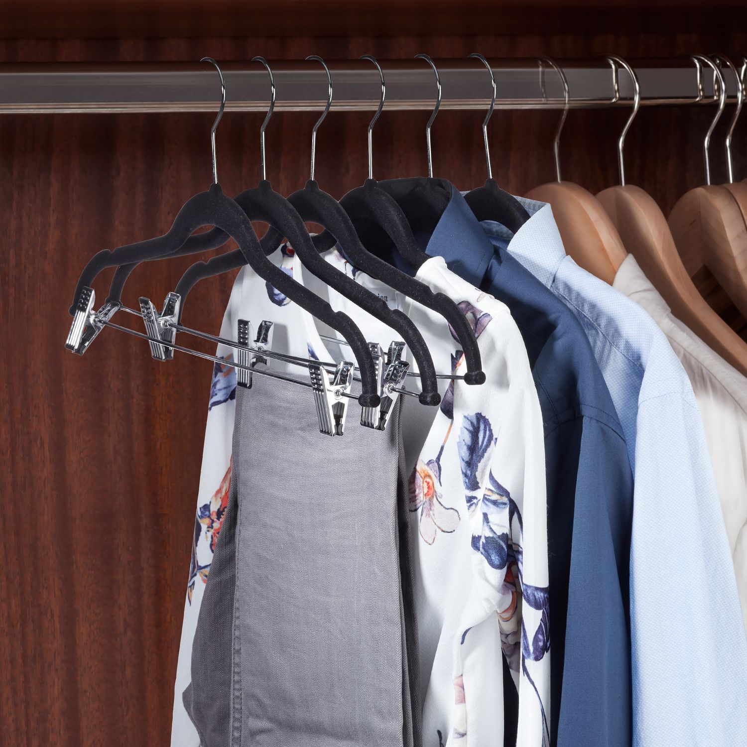 - Organize with ease using multi-functional hangers for suits and skirts.