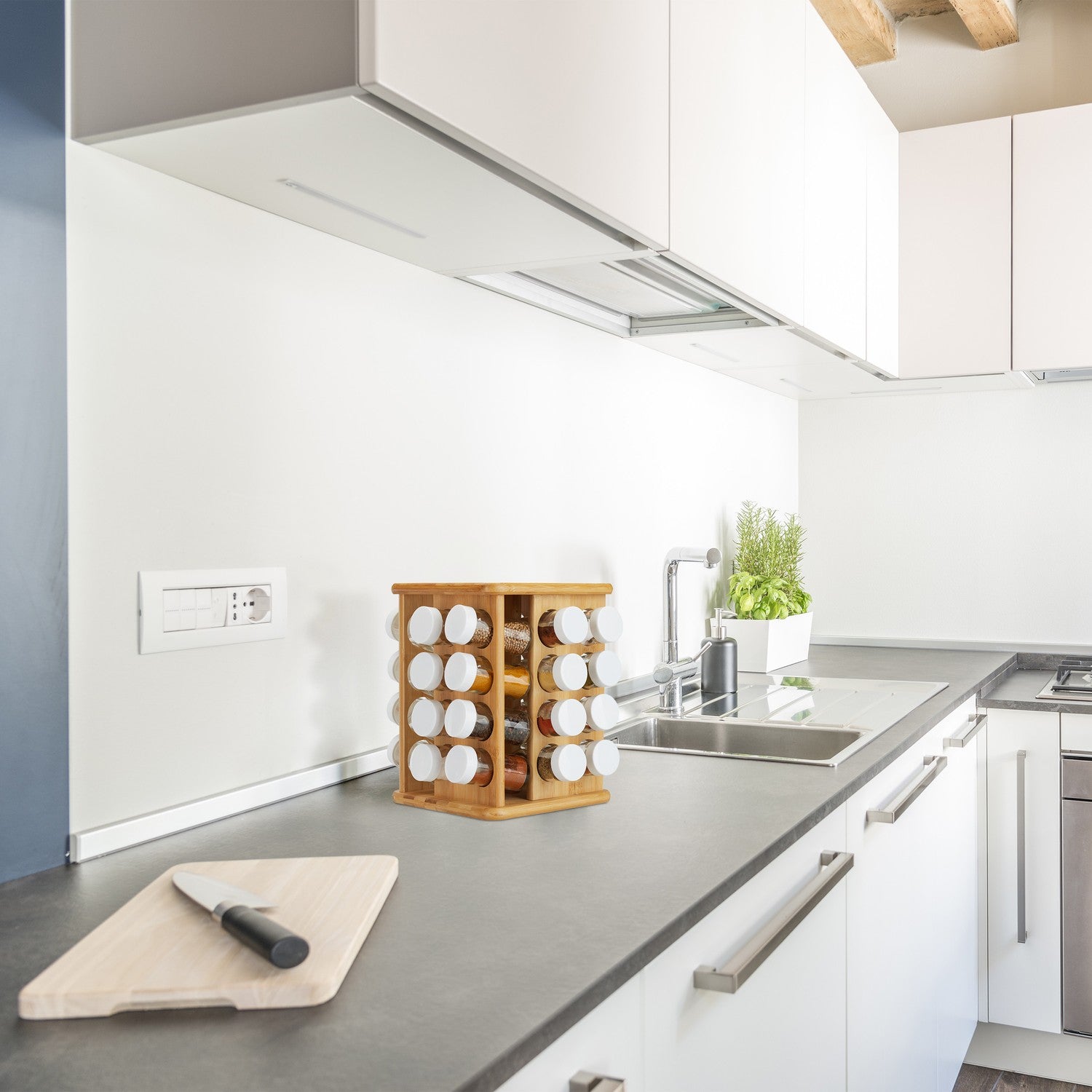 The XXL spice carousel offers efficient spice storage with sustainable bamboo construction, accommodating 32 glass containers for organized culinary creativity.
